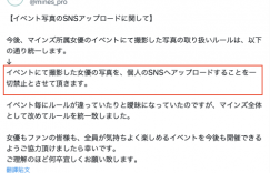 这是一个比蓝色小精灵的贾不妙还不妙的声明。经纪公司マインズ(Mine’s)在声明中是这么说的:从现在开始,所有マインズ(Mine’s)所属的女优参加的活动一律禁止影迷将照片上传到自己的SNS(社群)上ー是,也就是说不管是参加见面会还是摄影会,你还是可以照规定拍得很开心,只是照片就只能放在自己的相机、手机或电脑上来看,想要上传到X(twitter)、IG、脸书或是其他的社群网站是不行的〜