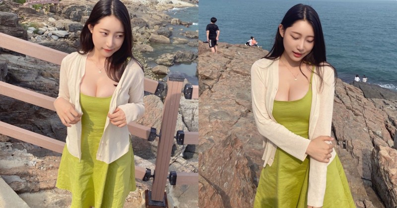 好天氣就是非常適合出門走走!最近看到一位正妹穿著青綠色短洋裝出去玩的美照,挖空的打扮即使穿了白色罩衫,還是擋不住那飽滿的美乳,畫面特別洶湧啊!看了也讓人好想出門踏踏青,看看有沒有機會可以巧遇啊~