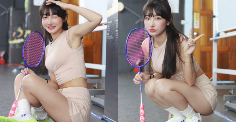 愛運動又長得漂亮的妹子直接加一百分!這次在羽球場邊發現這位回頭率超高的正妹,原來是JKF女郎「奇妙仙子」,粉膚色的運動套裝,可見纖瘦又緊實的四肢與腰間,就連在場邊休息也露出甜而不膩的笑顏,陽光魅力讓人馬上陶醉,PK起來一定輸在這美女手下!