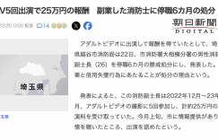 奇怪,怎么最近男优的新闻特别多?根据日本新闻报导,在埼玉县某消防队任职副士长(消防员的阶级,算是小长官)的26岁男子被抓到兼差拍AV,他在2022年12月到23年8月的时候拍了5支AV,收到25万日币(1.2万人民币左右)的片酬,现在要被罚停职半年〜